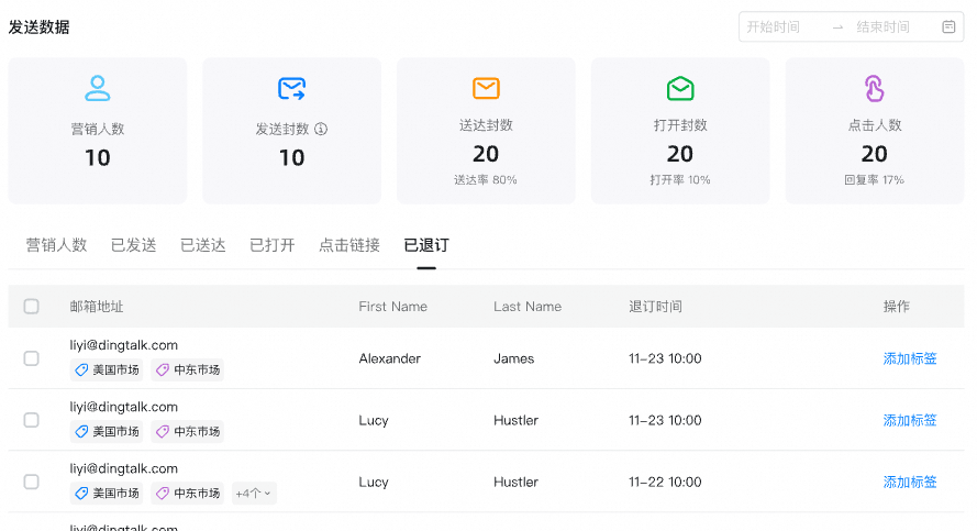 - 营销人数、已发送、已送达:可查看收件邮箱地址、名、姓、所属标签、发信状态。